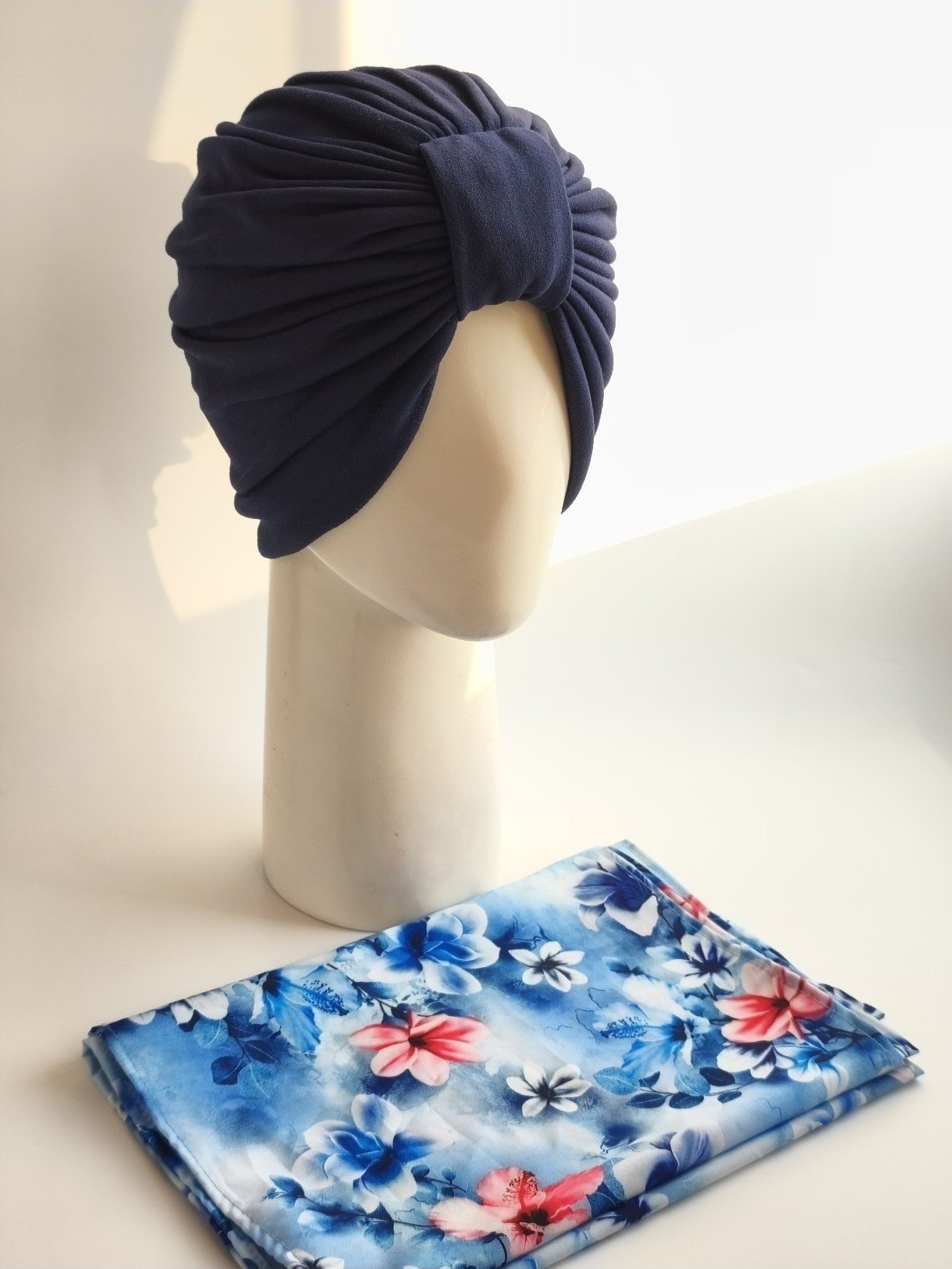 Gorro turbante con pañoleta – Azul Marino con pañoleta Azul floral .