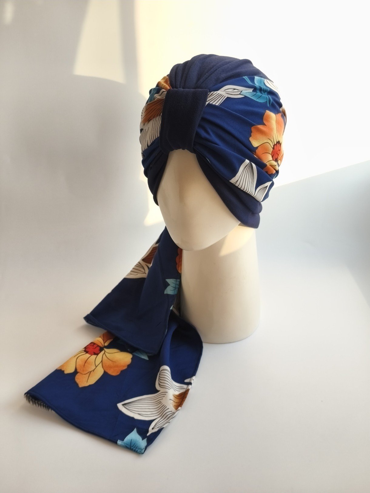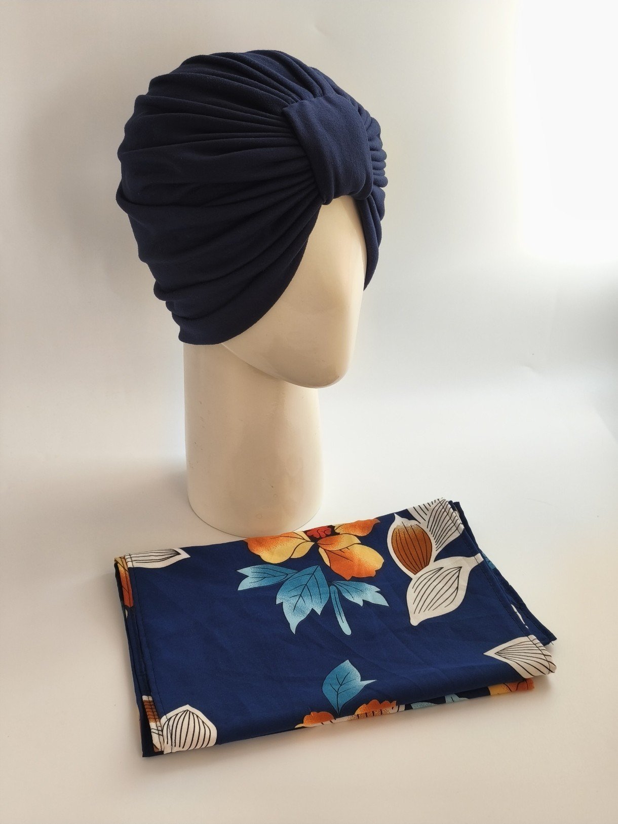 Gorro turbante con pañoleta – Azul Marino con pañoleta Azul Marino con flores Camell .