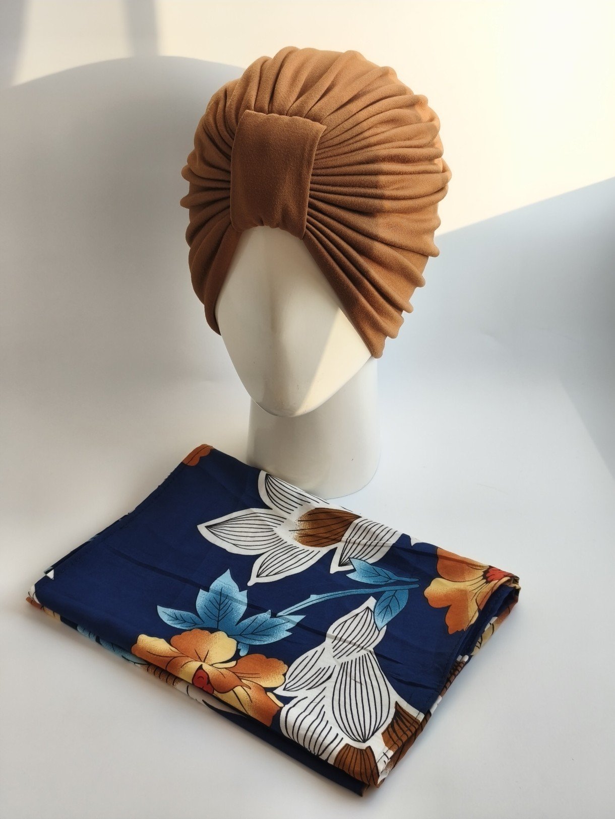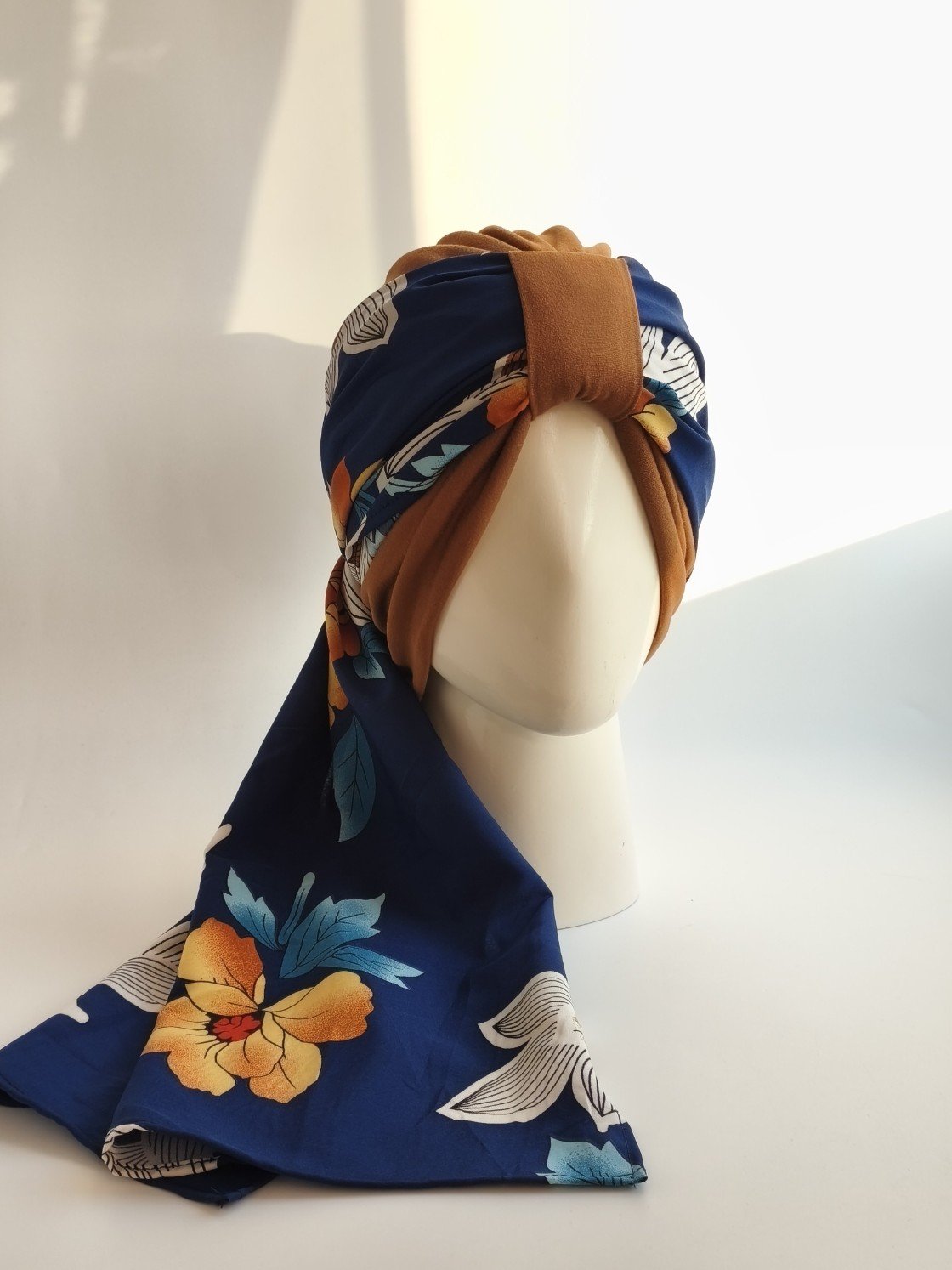 Gorro Turbante con pañoleta -Camell y pañoleta azul marino floral Camel .