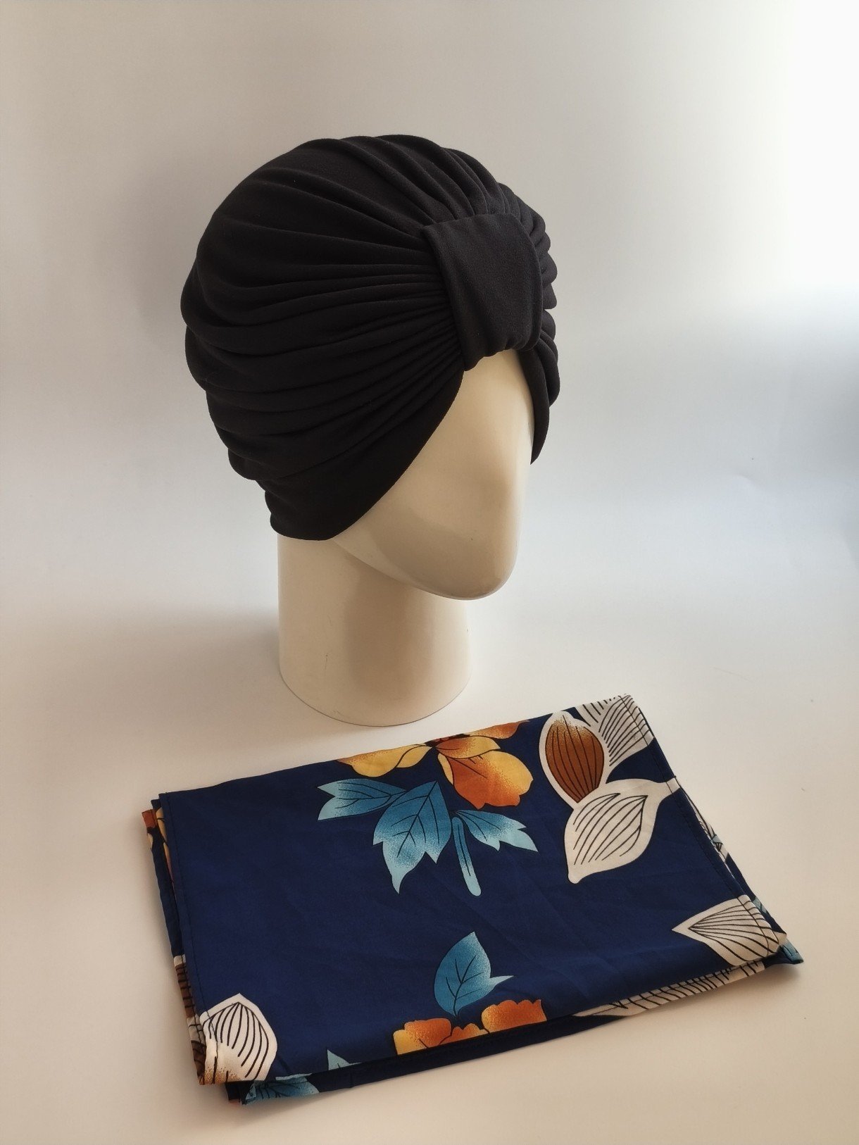 Gorro turbante con pañoleta -Negro con pañoleta floral azul marino .